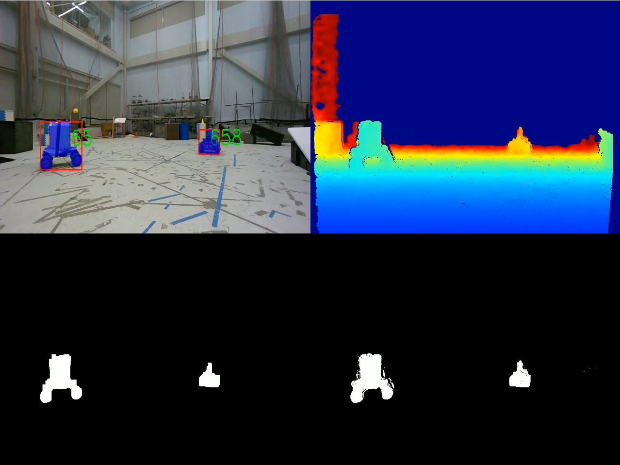 The ground truth pose data was collected using a Vicon motion capture system and recorded in a ROS2(Robot Operating System) bag. The Husky recorded a ROS1 bag with depth camera and pose data. We use our own ROS bag processing software for dataloading. Note that the ground truth collected above only provided pose information. Ground truth pose information combined with a rought estimate of the shapes of the robots allowed us to compute approximate bounding boxes. This allowed us to use SAM([2]) with bounding box-guided prompts to generate ground truth for the image segmentation.