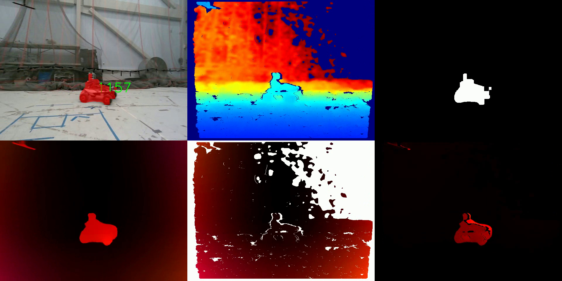 Representative videos of our algorithm running on the data we collected are shown below. Top left and right are the RGB and depth images. Bottom right is the velocity residual magnitude, and bottom left is the post-processed binary mask. Overlaid on the images are the tracked dynamic objects and their IDs. Noise is still present, but much of it is filtered out.